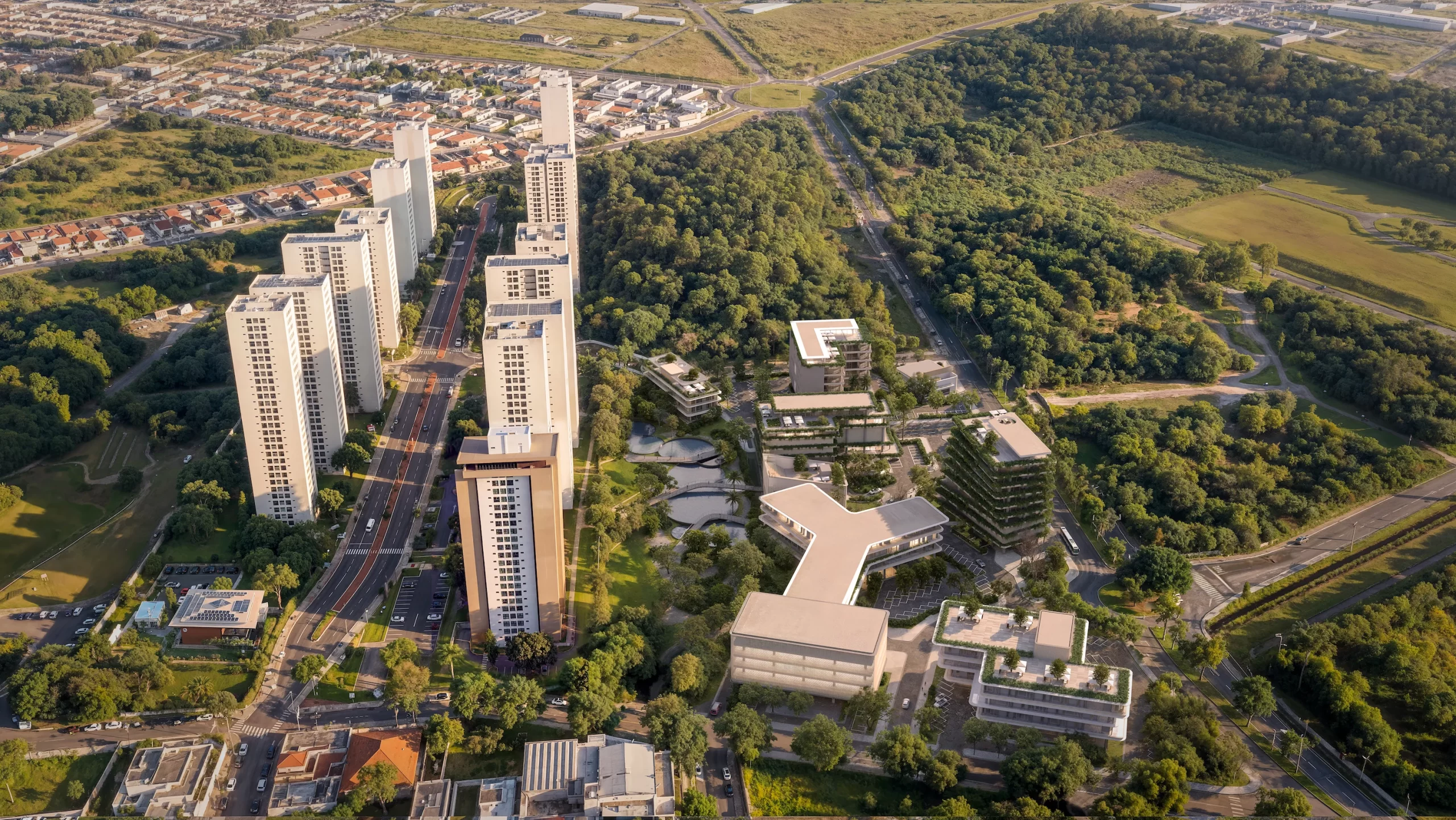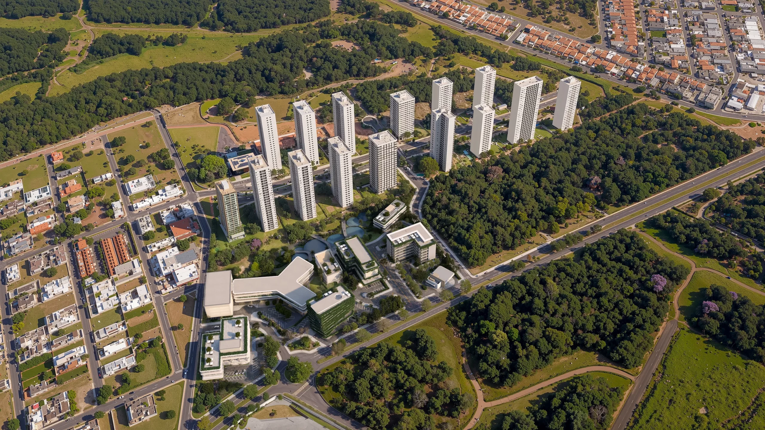 Com conceito de uso misto, ele combina residências de alto padrão, áreas comerciais, espaços corporativos e um parque linear arborizado, formando um ambiente moderno, organizado e autossuficiente.